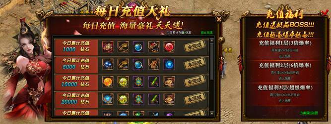 每日充值钻石数达到相应金额即可领取对应奖励。充值达到规定的